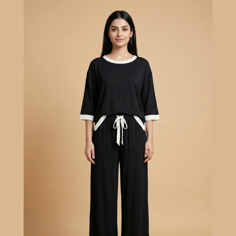 Deep Black Round Neck Plazzo PJ Set