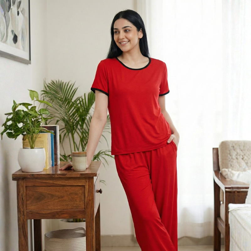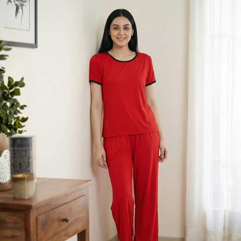 Plain Red V Neck T Shirt with Black Plazzo PJ Set