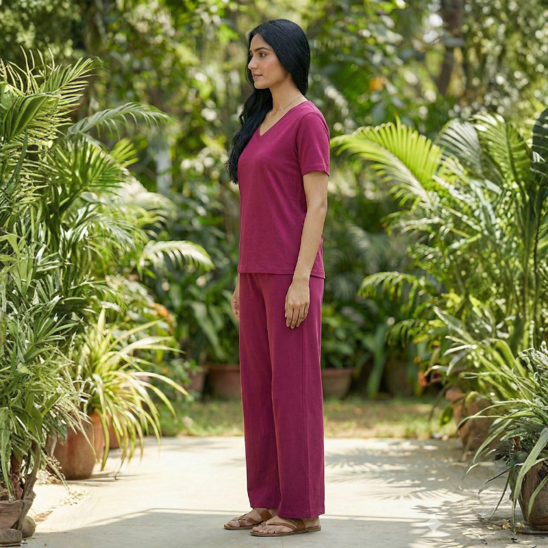 Plain Red V Neck T Shirt with Black Plazzo PJ Set